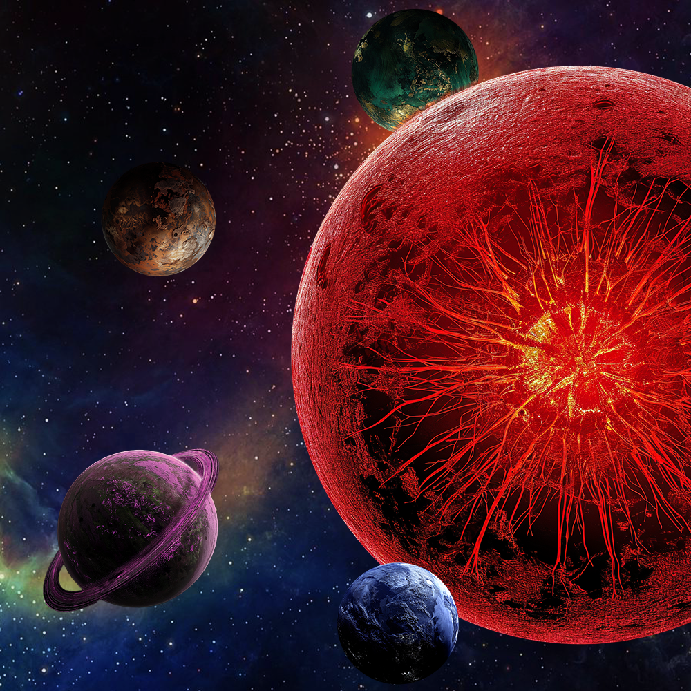 Un système particulièrement étrange de la Galaxie Ekklypse. Quatre planètes aux spécificités différentes en orbite autour d’un astre de magma glacé.